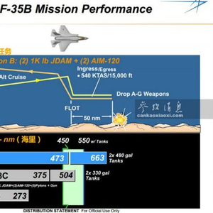 从洛马公司官方公开的F-35B作战性能看(如图所示),单架F-35B在执行空中遮断任务,携带2枚454千克级JDAM卫星制导炸弹和2枚AIM-120空空导弹(只使用内置弹舱)时,最大作战半径可达876千米,要远超采用同等载弹量的AV-8B和F-18C战机。