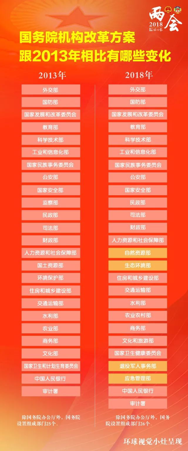 对比图:国务院机构改革方案相比2013年的变化 环球时报 环球时报官方账号 2018.03.1313:31 关注 今天,国务院机构改革方案提请十三届全国人大一次会议审议。改革后,除国务院办公厅外,国务院设置组成部门26个。下面一张图帮你看懂【国务院机构改革方案跟2013年相比有哪些变化】。制图:环球视觉小灶