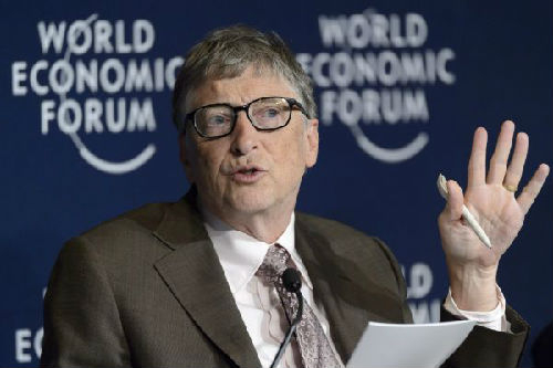 2016年1月22日,在瑞士达沃斯,微软公司创始人比尔·盖茨在世界经济论坛年会上发言。(新华/欧新中文)