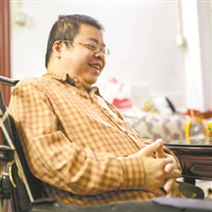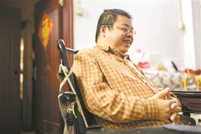46岁的黄志铭声音很有磁性。他斜靠在电动轮椅的靠垫上,上身穿深黄色格子衬衫,下身是一条军绿色长裤,脚底踩着拖鞋,理着短发,带一副无框眼镜,身体颇有些发福。发微信时,他会把手机靠到嘴边,用时下流行的语音输入法将说的话转化为汉字,只有在发出信息时,左手握着手机的他,才会缓慢而怪异地伸出右手食指,按下“发送”键,如小鸡啄米一般。