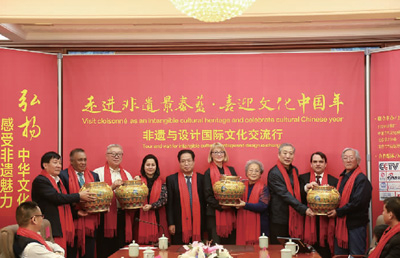 2018年2月2日下午,“走进非遗景泰蓝·喜迎文化中国年”非遗与设计国际交流行活动在北京珐琅厂举行。斯里兰卡驻华大使卡鲁纳塞纳·科迪图瓦库、拉脱维亚驻华大使夫人玛丽卡·塞尔嘉、巴基斯坦驻华大使馆媒体兼文化官希娜·费尔多斯、智利驻华大使馆领事塞巴斯蒂安·兰波等出席了活动,并就“如何搭建国际合作平台,做好各国文化遗产的传承、保护和发扬”展开讨论。活动中,中方将“海晏河清”盛世国尊作为中方“非遗”文化礼品赠与他们,并表达了中国愿与世界各国“交流互鉴、合作共赢、共同繁荣”的美好愿景。