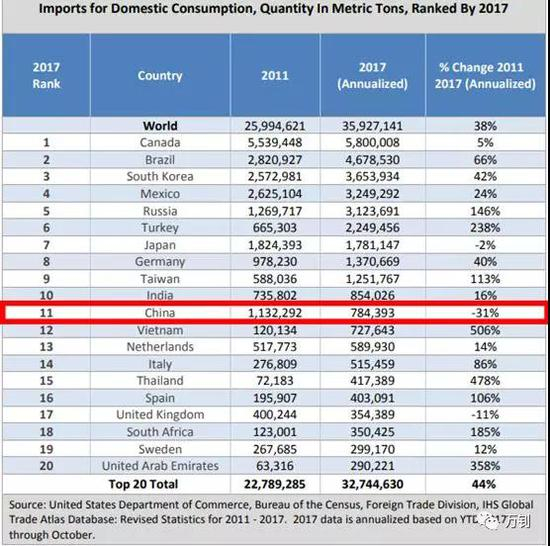从2017年美国所有钢制品进口总量上看,中国只排在第11位,前五名分别是加拿大、巴西、韩国、墨西哥以及俄罗斯。自中国的进口量仅为第一名加拿大的13.5%,而且从2011年至2017年,中国对美国的钢铁出口量下降了31%,为前20位中下降幅度最大的。此外,美国从中国进口的铝制品排名第四,虽然比钢铁排名靠前,但依然无法撼动加拿大对美国铝制品出口的支配地位。