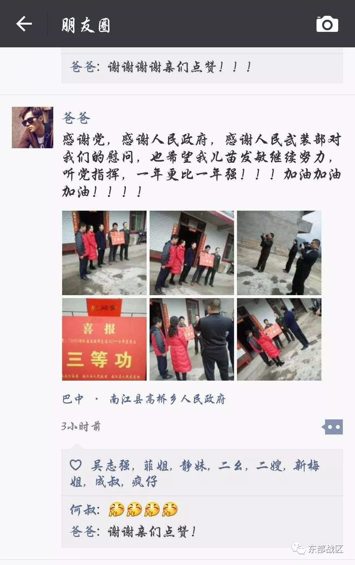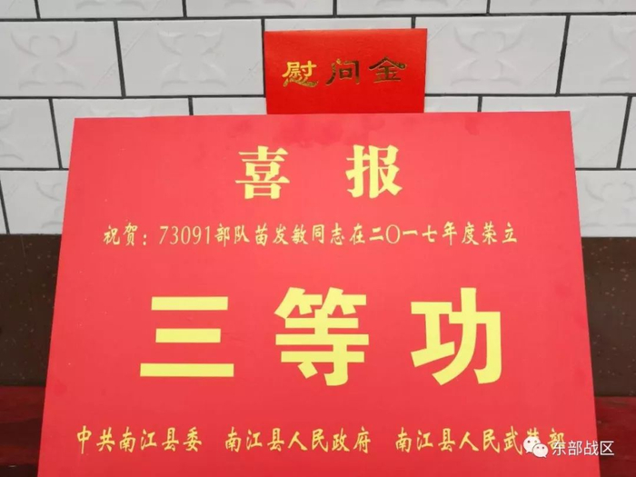 原来是在陆军第72集团军某旅当兵的苗发敏立功了。南江县政府和武装部的领导得知苗发敏立功后,当即决定一定要把喜报和慰问金送到苗发敏家中。