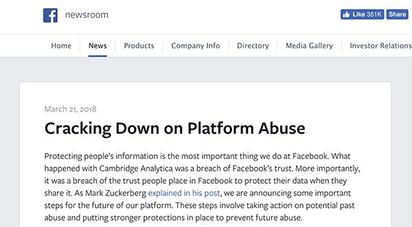 Facebook官方发布声明,提出防止用户数据被滥用的举措。