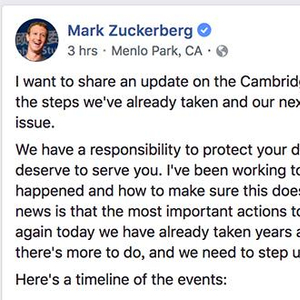 扎克伯格在声明中称,这虽然是Kogan、剑桥分析和Facebook 之间的信用问题。但确实违反了Facebook与用户之间的信任。
