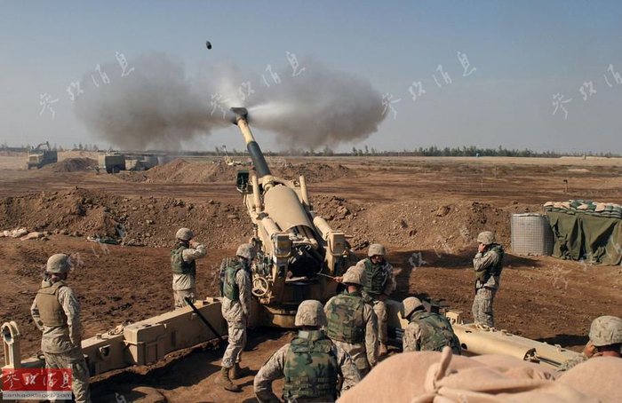 2004年11月11日,第二次费卢杰之战期间,费卢杰城外,美海军陆战队第4营的炮兵正操作M198榴弹炮向城内反美武装炮击。