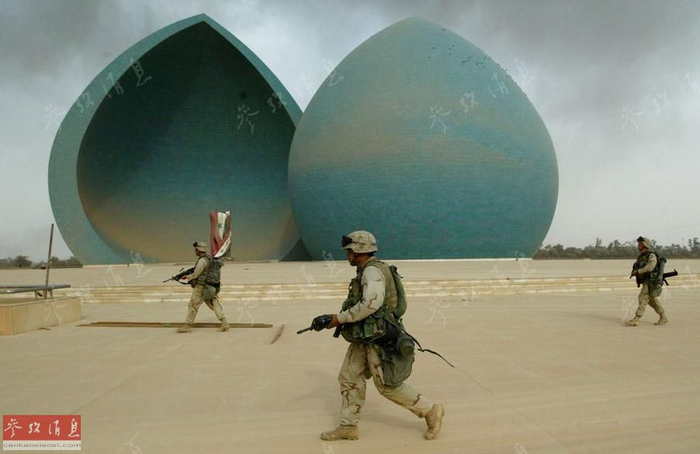 2003年4月9日,首都巴格达,隶属于美陆战队第7团L连的士兵从烈士纪念碑旁走过,他们当时正在执行占领市中心的任务。