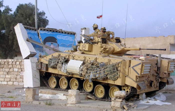 2003年3月24日,伊拉克南部城市巴士拉,一辆英军“武士”装甲车撞倒了一面画有萨达姆头像的墙。