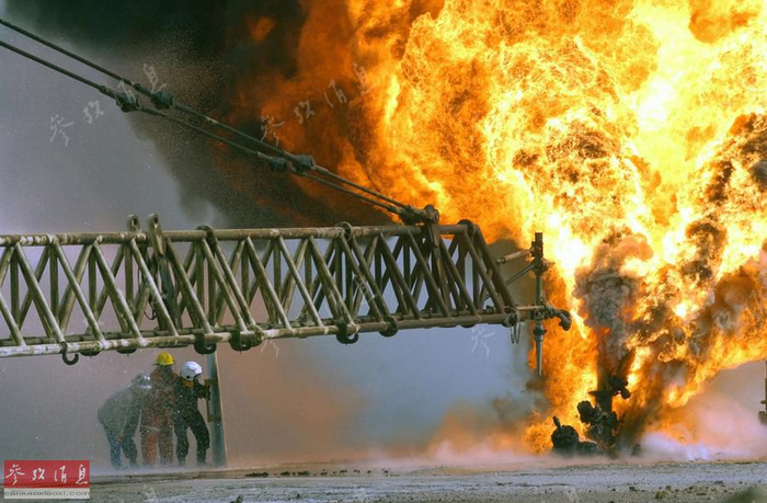 2003年3月27日,伊拉克南部Rumaila油田,科威特消防员正试图扑灭一口被伊拉克军队点燃的油井。