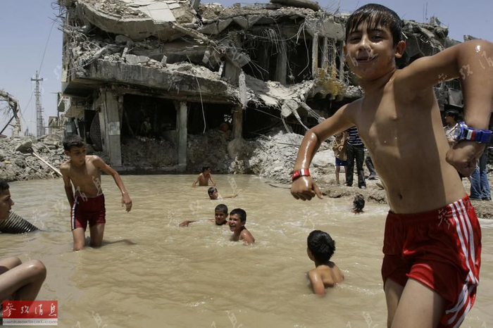 2008年5月20日,巴格达萨德尔城内,几名伊拉克男孩在废墟的池塘中嬉戏。