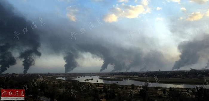 2003年3月27日,巴格达郊区外,可以看到多座被伊拉克军队点燃的油井,目的是依靠浓烟降低美军战机和导弹的命中精度。
