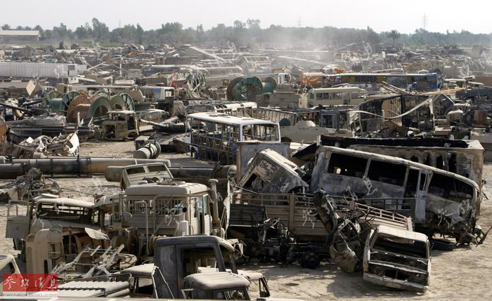 2003年5月25日,巴格达市郊的一处废品回收站内,这里有很多被美军空袭摧毁的伊军队军车,但这些车辆多数是被美军战机用贫铀弹药摧毁,残骸上仍残留有辐射。