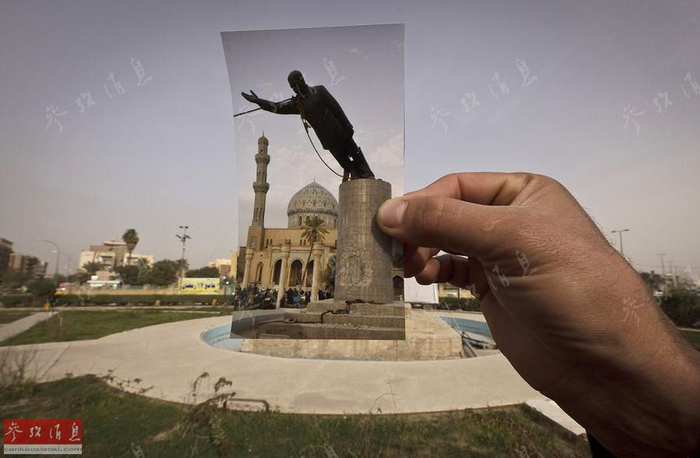 2013年3月13日,伊拉克战争爆发10周年后,巴格达Firdos广场,美联社记者在当年萨达姆铜像被拉倒的同一位置拍了一张纪念照。