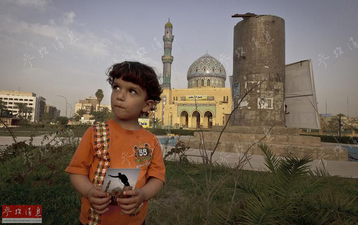 2013年3月14日,伊拉克战争爆发10周年后,巴格达Firdos广场,一名3岁伊拉克男孩握着当年被拉倒的萨达姆铜像照片在原地址留影。