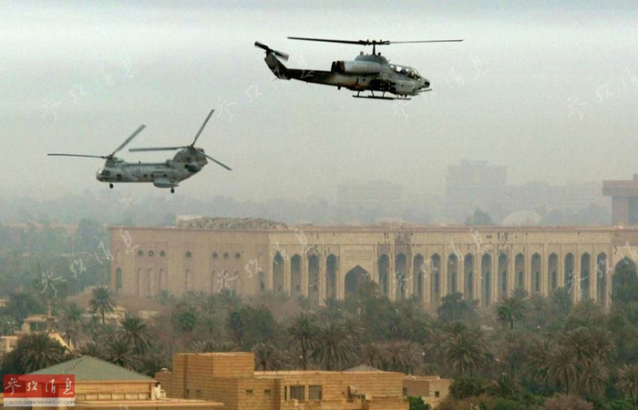 2003年4月13日,首都巴格达上空,一架美海军陆战队的AH-1W攻击直升机在执行巡逻任务,远处有一架CH-46运输直升机飞过。