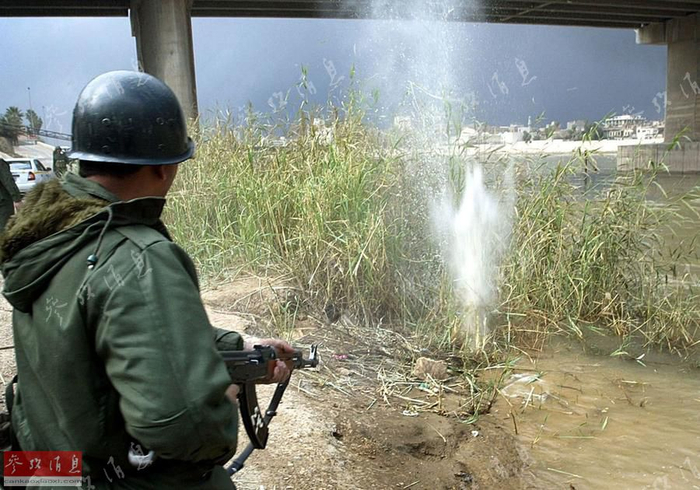 2003年3月23日,巴格达底格里斯河岸边,一名伊拉克士兵正用AK-47扫射可疑区域,此前有报道称有美军或英军战机飞行员在巴格达上空弹射,伊军出动搜寻可疑区域。