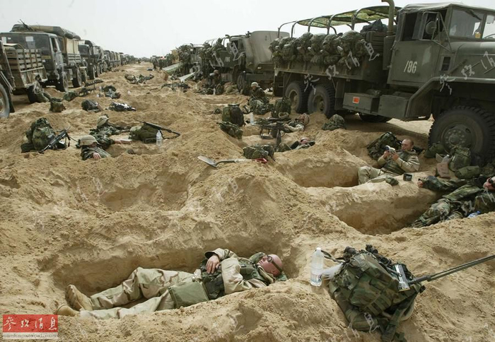 2003年3月21日,科威特北部沙漠,隶属于美军第101空中突击师、第3旅的士兵在散兵坑内休整。