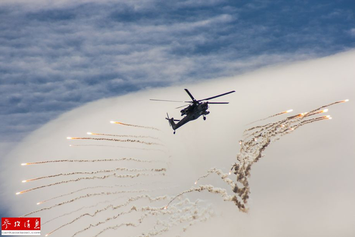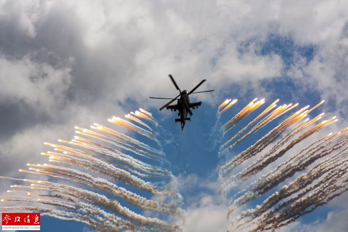 图为在竞赛中发射热焰弹的卡-50武装直升机。
