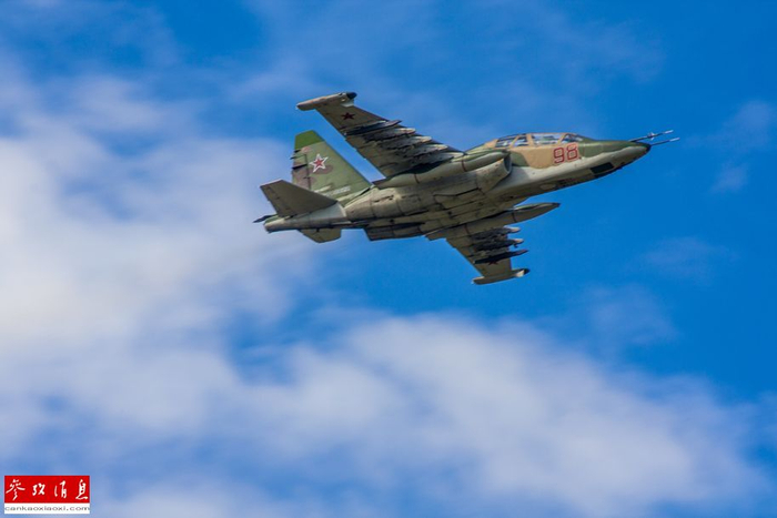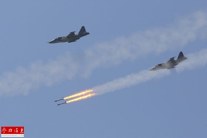 图为苏-25攻击机正在对地面目标倾泻火箭弹。