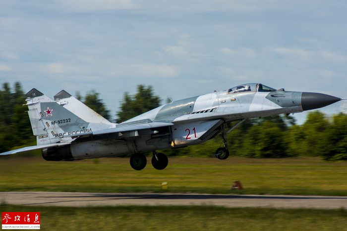 图为参加竞赛的米格-29SMT战斗机。正在起飞的这架与米格-29早期型的最大区别,就是在机背加装了保形油箱。