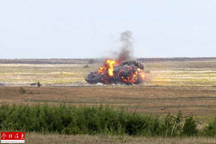 图为在比赛中俄军战机对地面假想目标进行攻击后的爆炸效果。