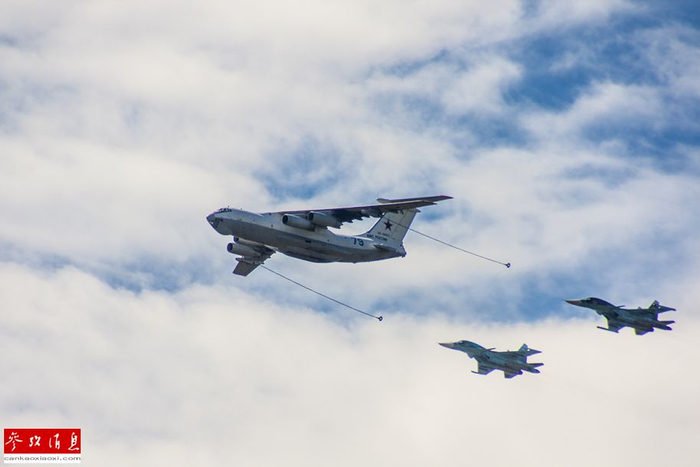 图为俄军伊尔-78空中加油机准备对2架苏-34战斗轰炸机进行空中加油。