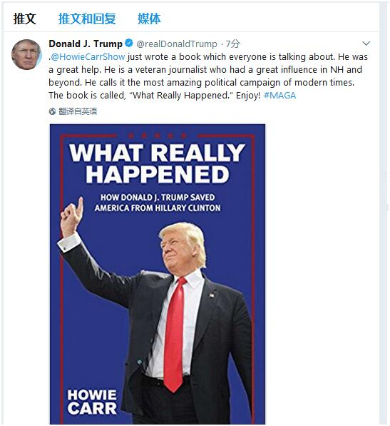 特朗普推特上安利“神队友”所著新书,目标直指希拉里!
