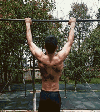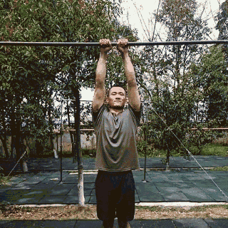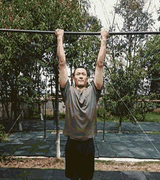 双手正握单杠,两臂的距离比肩稍宽,腰背以下部位放松,背阔肌充分伸长,两小腿自然伸直并拢,然后用力拉杠,集中背阔肌的收缩力,屈臂带动身体向上。