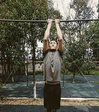 双手正握单杠,两臂的距离与肩同宽,腰背以下部位放松,背阔肌充分伸长,两小腿自然伸直并拢,然后用力拉杠,集中背阔肌的收缩力,屈臂带动身体向上。