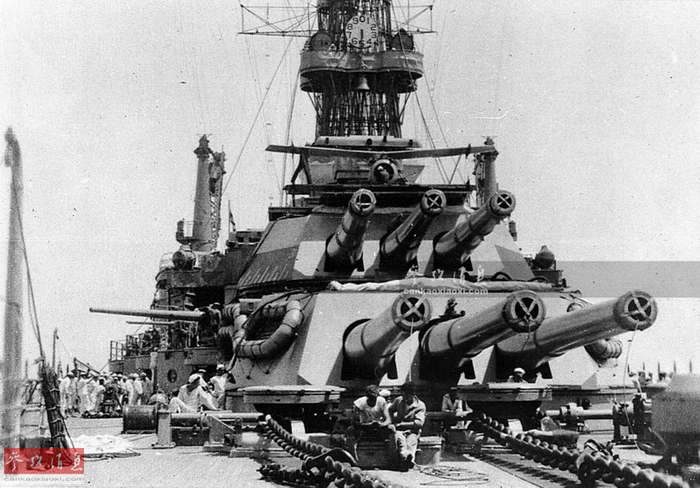 图为从舰艉方向拍摄的“密西西比”号的3号、4号主炮塔,摄于美国本土诺福克海军船坞,1942年1月。