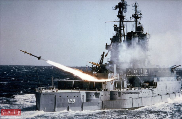 图为已改装为AG-128导弹试验舰的“密西西比”号试射“小猎犬”中程舰空导弹资料图。