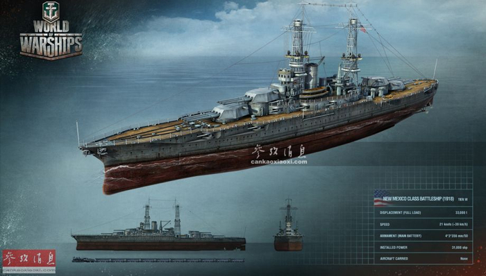“密西西比”号全长190米,全宽29.7米,吃水9.1米,满载排水量3.3万吨,为新墨西哥级战列舰的2号舰,于1915年开工建造,1917年投入美海军服役,1919年7月加入太平洋舰队。与宾夕法尼亚级相比,该舰的最大改进在于采用了新型飞剪式舰艏,可大幅改善恶劣海况时的航行稳定性。动力装置则改用蒸汽轮机带动发动机驱动,最大航速21节。图为游戏中的新墨西哥级CG多视角图。