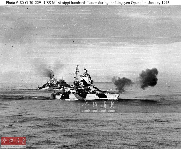 作为美海军的元老级战列舰之一,“密西西比”号在二战期间参加了多场海战,其中最有名的要数发生在1944年10月25日晚的苏里高海峡海战,该舰与另外5艘“元老”战列舰一同参与了这场历史上最后一次阵列式海战,击沉日军2艘战列舰,1艘重巡洋舰及3艘驱逐舰,为珍珠港事件一雪前耻。图为1945年1月,“密西西比”号正在使用主炮轰击菲律宾吕宋岛上的日军目标。