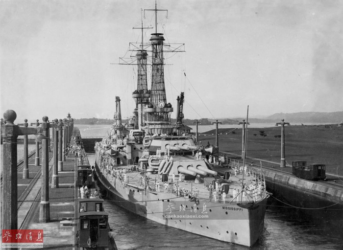 图为20世纪20年代拍摄的正在通过巴拿马运河的“密西西比”号,注意标志性的的笼式主桅杆,以及桅杆基座的射击钟,都是当时美海军战列舰特有的标志。