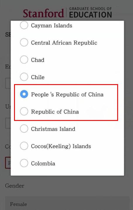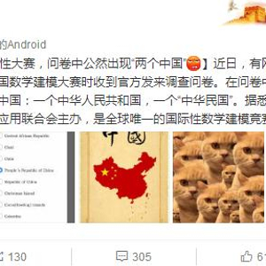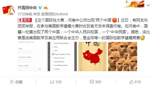 【环球网综合报道】据共青团中央微博3月29日消息,有网友举报,在参与美国数学建模大赛时收到官方发来调查问卷。在问卷中,国籍一栏竟出现了两个中国:一个中华人民共和国,一个“中华民国”。