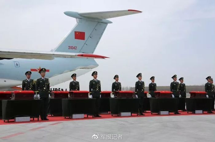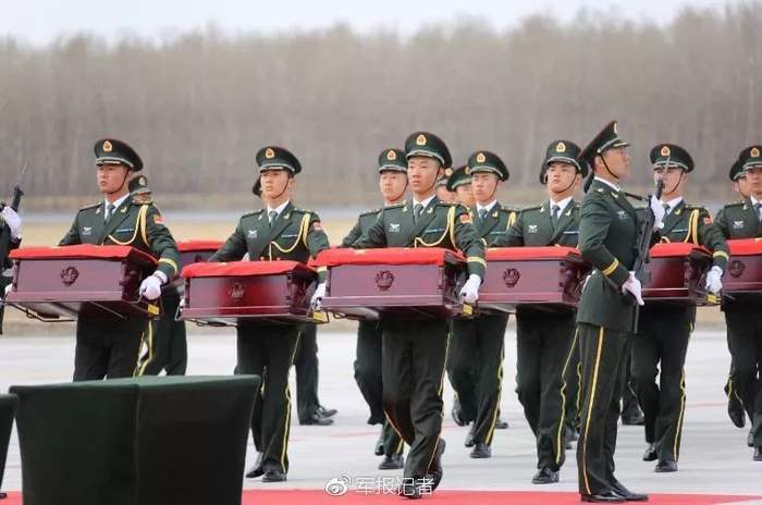 3月28日,20具裹覆着五星红旗的志愿军烈士遗骸,在解放军空军战斗机护送下,由大型军用运输机运送回国。20名身着军礼服的解放军军官,一路护送前往烈士陵园安葬。在场见证的军人、记者无不动情,潸然泪下。