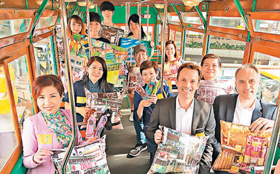 香港120号电车上,乘客与电车主题艺术品合影。