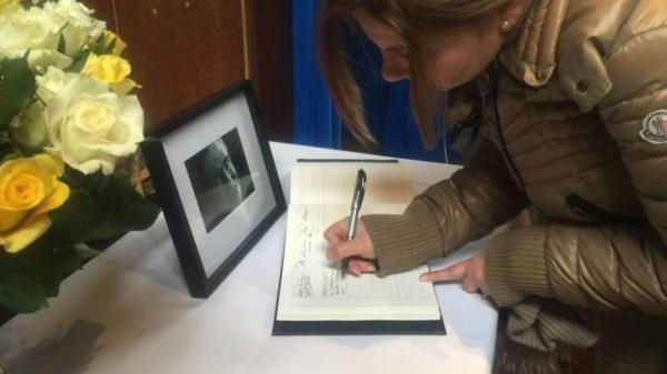 人们在剑桥大学准备的留言本上写下哀思。