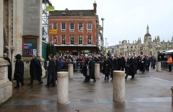 霍金灵柩抵达圣玛丽教堂外,剑桥大学的6名搬运工为霍金抬棺。