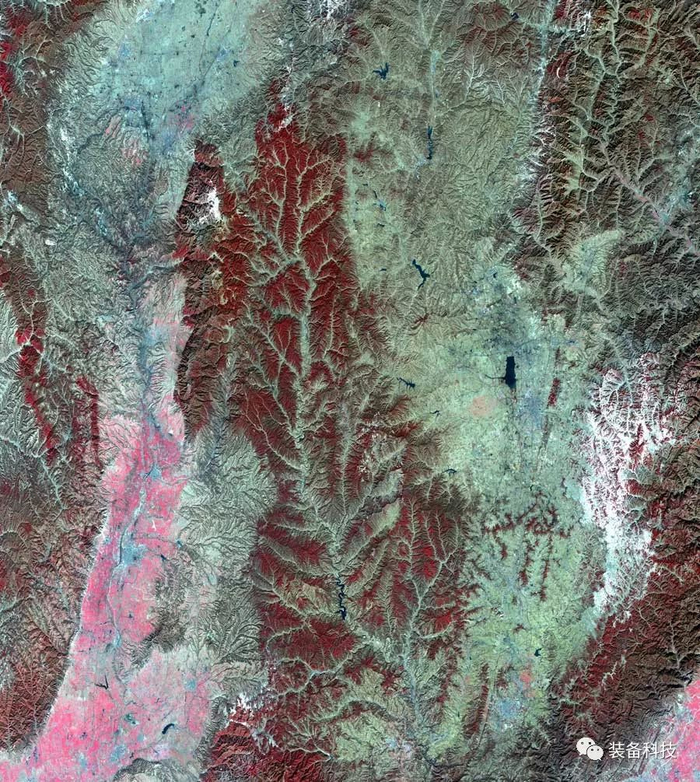 ▲大地上的“红叶”:山西长治市附近。(“高分一号”卫星-WFV多光谱相机 2013年11月27日观测,图像大小200公里x200公里,空间分辨率16米。)