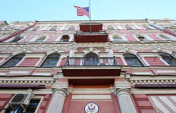 当地时间2018年3月29日,俄罗斯圣彼得堡,美国驻圣彼得堡领事馆。当天,俄罗斯外交部长谢尔盖-拉夫罗夫表示,俄罗斯将驱逐60名美国外交人员,并关闭美国在圣彼得堡的领事馆,以此作为对美国和英国发起的大规模驱逐俄罗斯外交官行动作出回应。东方IC 图