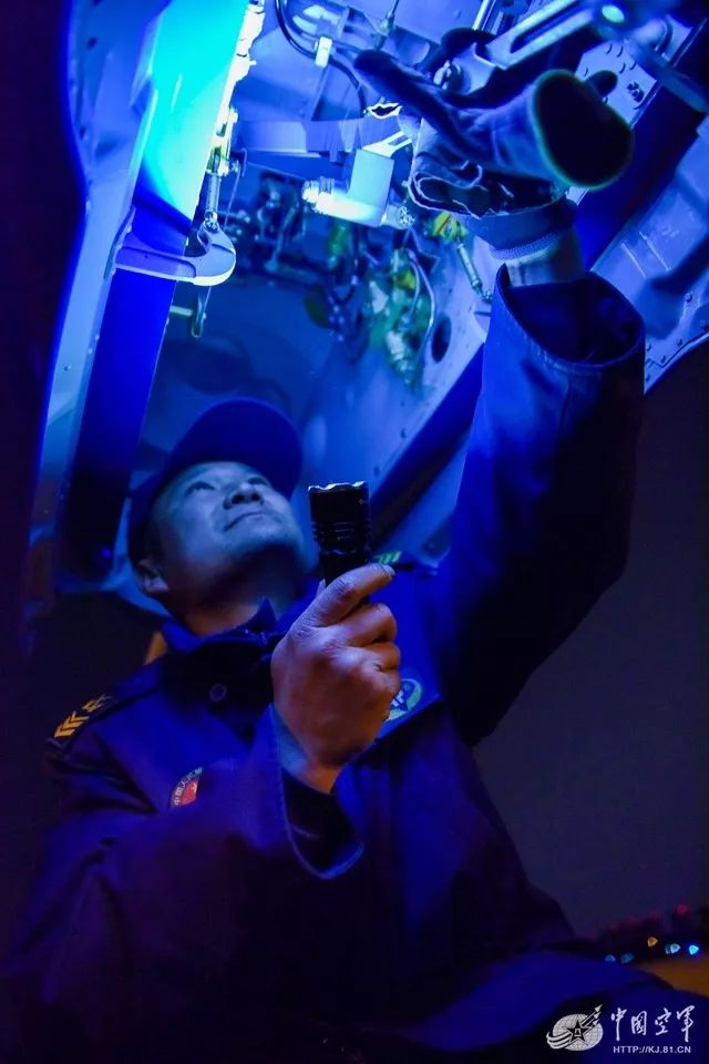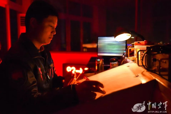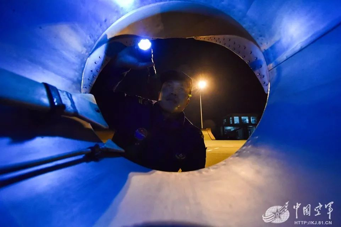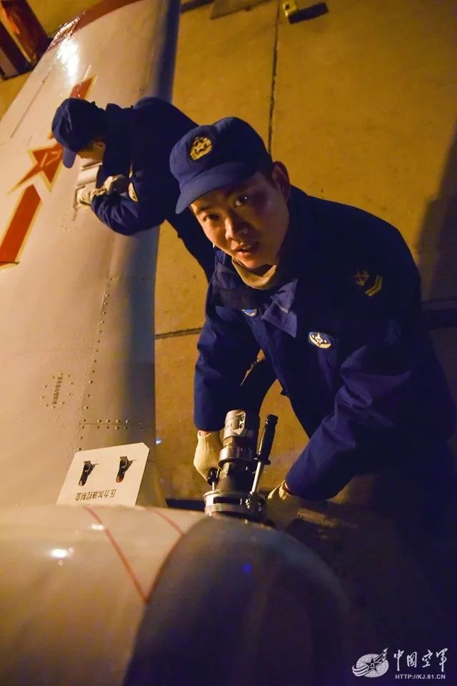夜空中每留下一道光痕,总能在停机坪上找到与之对应的手电筒灯光。在战鹰机腹下或是输油管的末端,机务战线上的官兵用结实的肩膀扛起“极端负责,精心维修”的职责担当。