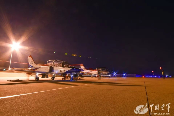 总有人带着一点憧憬,好奇“凌晨两点钟停机坪的样子”,从夜航这个维度看来,它是繁忙而有序的。飞行教学员们穿戴装具,接收飞机,驾驶战鹰滑出机位;机务人员精心保障,快速排故,扎实做好再次出动准备;后勤人员调度车辆,养护场道,观测气象,坚守哨位……每个人在各自的战位上履职尽责、协同联动,确保夜航训练顺利安全,万无一失。
