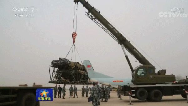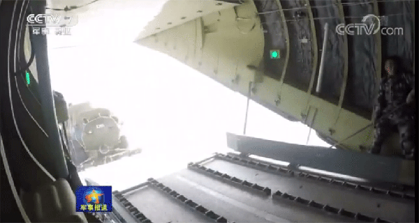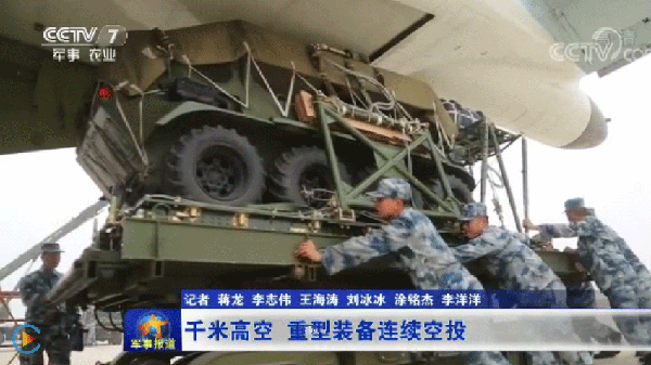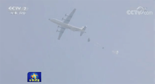 15架运输机满载重型装备物资,飞往预定空投地域,飞机上,投放员对捆绑细节、空投伞状态再次进行检查确认,随着战机后槽门开启,数吨重的装备物资沿着轨道快速滑离舱门,高空中,一朵朵巨大的伞花缓缓张开。着陆瞬间,伞具和装备快速分离,地面战斗员迅速解绑装置,携带作战物资驶向预定集结地域。