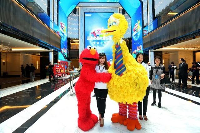 美国芝麻街艾摩和大鸟空降发布会 和现场观众积极互动