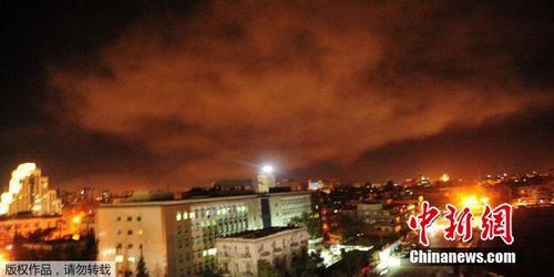 14日,美英法对叙空袭,炮火染红大马士革夜空。