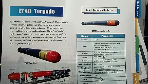 ET40型外贸鱼雷的展板介绍,该鱼雷主要装备在潜艇上。