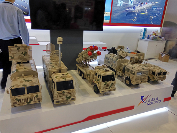 北方工业展出出的防空武器体系,包括“天龙”-50中程防空导弹和35毫米车载高炮。
