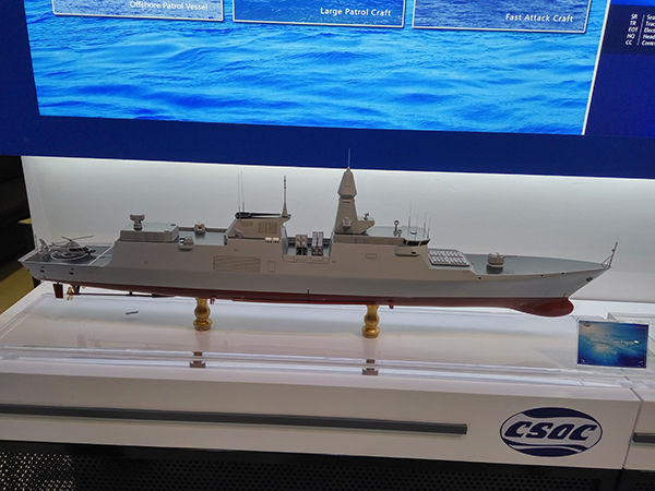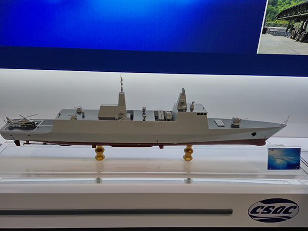 此次防务展,海军武器装备是一大亮点,不但有多种水面舰艇,还有多种潜艇及舰载武器。图为4000吨级外贸护卫舰,外形上与054A型护卫舰类似。