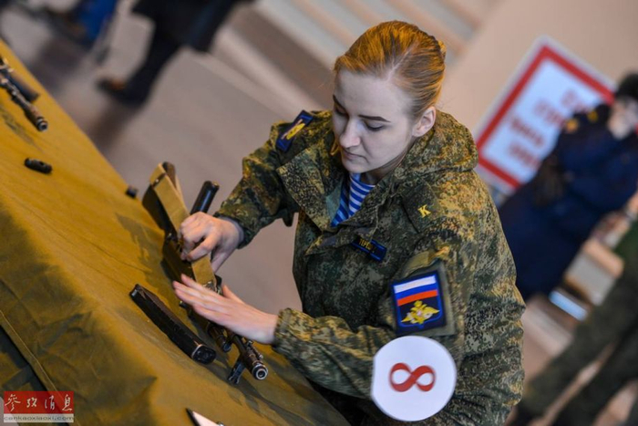 另一名参加步枪分解与组装比赛的俄军女兵。